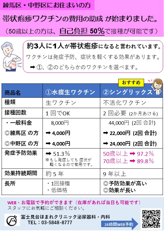 帯状疱疹ワクチンの費用助成 24時間 インターネット予約ができます。 ご予約は、 インターネット予約 > ワクチン > 帯状疱疹ワクチン から ご希望のワクチンをご選択ください。 ・ シングリックス ・ 弱毒水痘生ワクチン *練馬区にお住まいの方は、当日に接種券をおもちください。